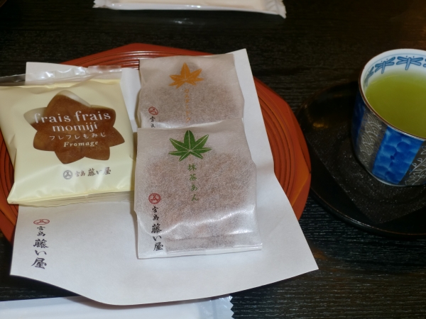 ご飯も食べて風も出てきたので下山して、自由行動を少し。でもみんな、集合時間より早めに集まっていました。僕は牡蠣の殻つき焼きともみじまんじゅうを店内でいただきました。宮島といえばやはりもみじまんじゅうをお茶と頂かないと・・・ですよね!?
