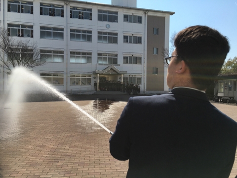 その後放水訓練も行いました。写真は生徒会役員の畑 くん。狙ったところに放水できたようです。