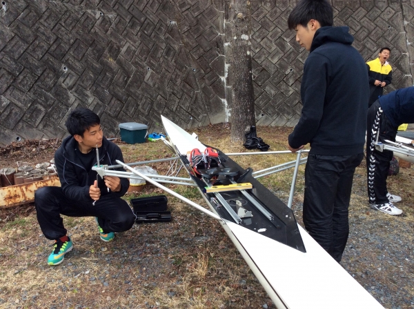 午前中は他の選手の漕ぎを見ながら技術の習得。さすが全国大会、レベルの高さに驚きます。午後は、いよいよ公式練習です。リギング、自分のレーンの試漕、デリグを2時間以内にこなします。本日は強風の中、行なわれました。