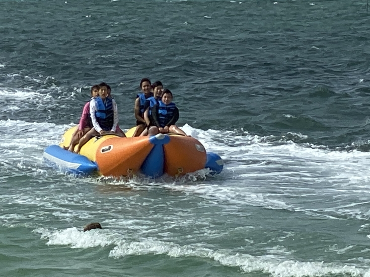 沖縄コース2日目アクティビティ 修学旅行 2019.10.092020.03.10 与論島への渡航を中止しましたので 1日目のホテルに連泊することになりました。 ホテルに戻って、さっそく海へ!!!! バナナボート アスレチック ウォータースライダー 温水プールもあります! シーサー作り、Tシャツ作りも♪ 時間いっぱいあました。 夕食はバイキング♪♪5種類の店から選べます。 画像はビーチ側でBBQをする生徒たち。 今日はたくさん動いたので夕食も美味しく感じたことでしょう! しっかり休んで明日に備えましょう。