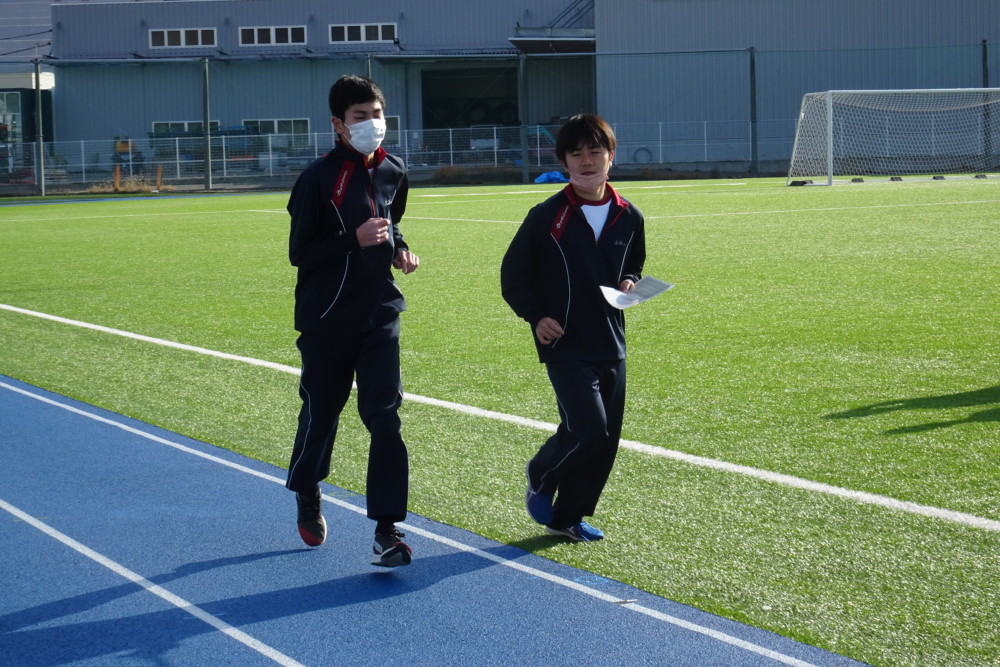 授業風景~体育 長距離走~ トピックス 2022.01.25 12月から1月末まで1,2年生の体育は長距離走を行っています。 最後に男子5,000m、女子3,000m走のタイムを測定して終了となります。 今日は2年生のあるクラスが、その「難関」に臨みました。 颯爽とスタート。昨春リニューアルした人工芝とタータントラックが映えます。 ラスト1周。仲間の応援が力になります。 ゴール!走り切りました。 長距離走は苦手な生徒も多い種目ですが、本当によく頑張りました! その粘りを勉強に生かしましょう。 (石田)