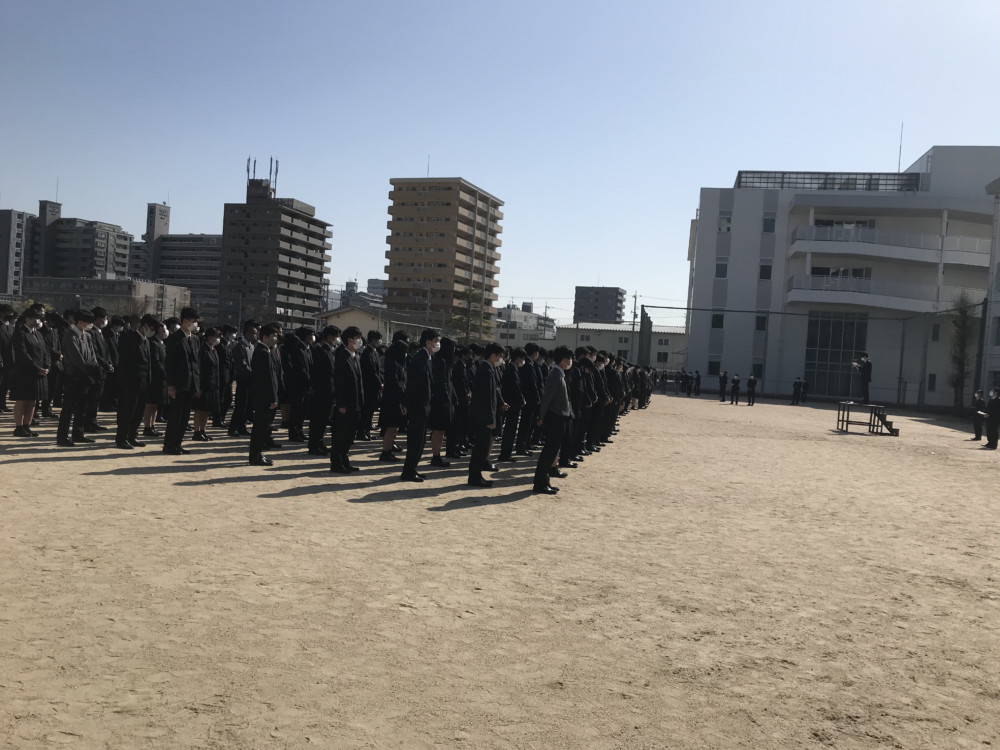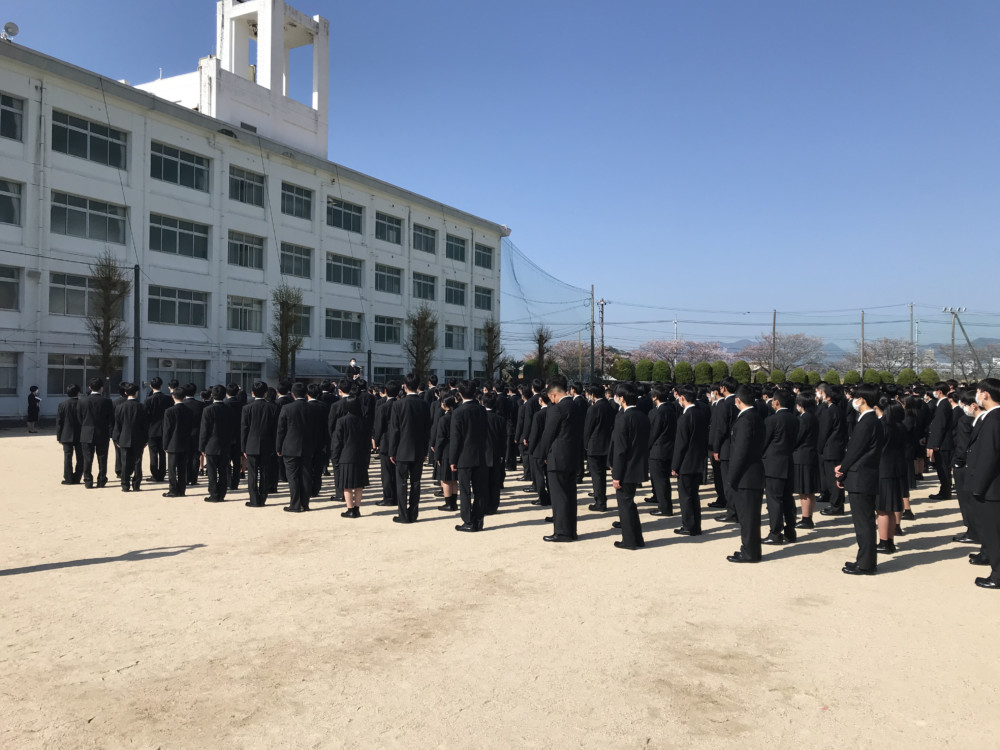 こちらは1年生後半クラス。奥の朝礼台では挨拶をしている生徒会長の様子が写っています。