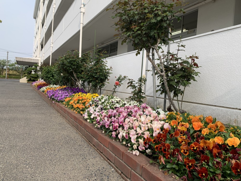 山下先生は御年77歳。本校の数学科の先生で教頭先生でした。65歳で定年退職した後は13年間本校の花や樹木の世話をしてくださっています。校内だけでなく、八幡川の土手にある花も山下先生がすべて世話をしています。5月にはバラが満開になる予定ですが、今咲いている花をお届けします。