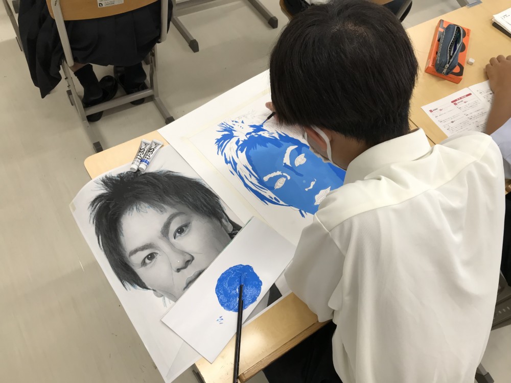 【1年生美術】1学期の作品を展示しました。 トピックス 2022.07.23 1学期美術の授業を紹介します。 1年生の美術選択者はポスターリ―ゼーションの手法をつかってタレント・有名人の顔を描くことに挑戦しました。 ポスタリゼーション(階調変更)とは、画像の階調(色数の表現段階)を下げる画像処理です。 タレントや有名人の顔は自分で選びました。こんなに長い間じっくりと人の顔を見て描く経験はなかったことでしょう。 どの作品も色調を調節しながら、リアルに再現出来ています。 1学期の作品は来年3月まで、3号館1階美術室に展示しています。 学校に立ち寄られた際は是非ご覧ください♪