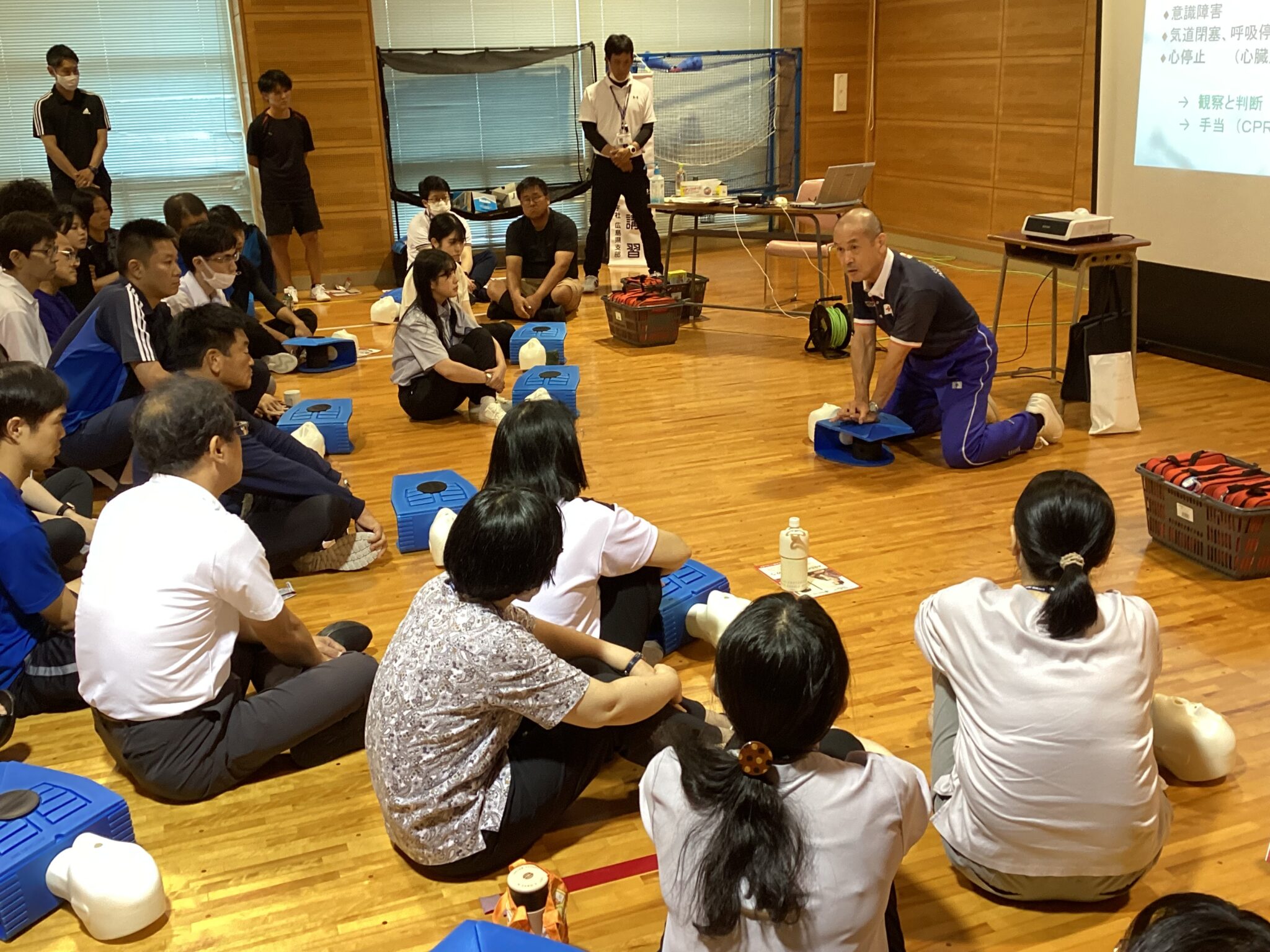 【教職員】救急法講習会 保健室 2024.08.29 8月28日(水)に日本赤十字社広島支部から講師をお招きして救急法講習会を行いました。 緊急を要する際に、的確な判断と迅速な行動ができるよう、毎年行っています。 講習会では、傷病者発見時の観察ポイントから確認し、胸骨圧迫の仕方やAEDの取り扱い方を学びました。また、シミュレーション訓練では、クラブ活動中の心停止事故を想定して行い、組織的な動きについて確認する機会となりました。 2時間という限られた時間でしたが、とても実のある研修となりました。 (保健室)