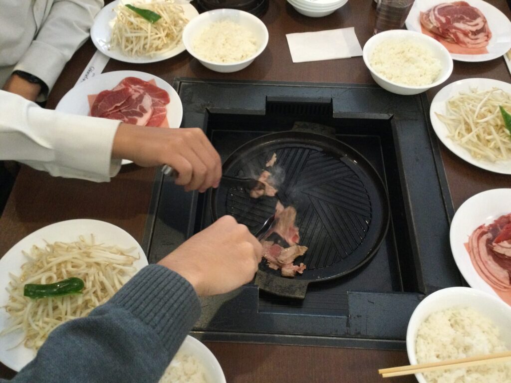 ラム肉と豚肩ロースを焼いて、特製のタレでいただきました。