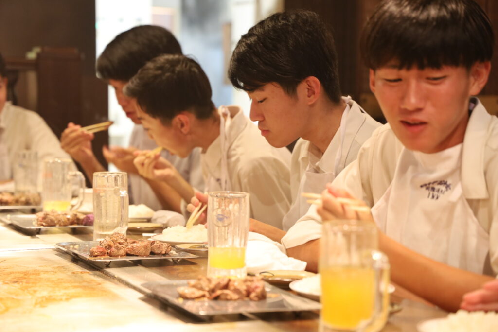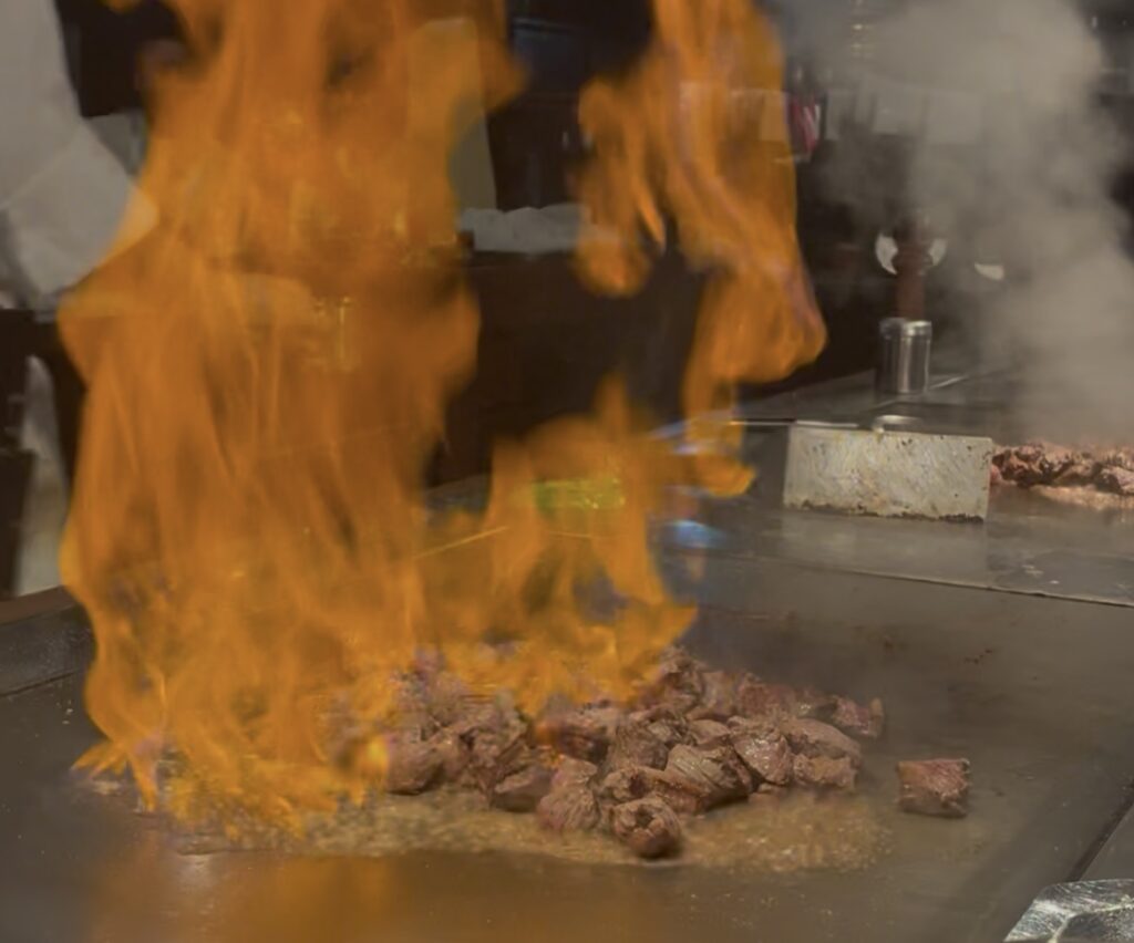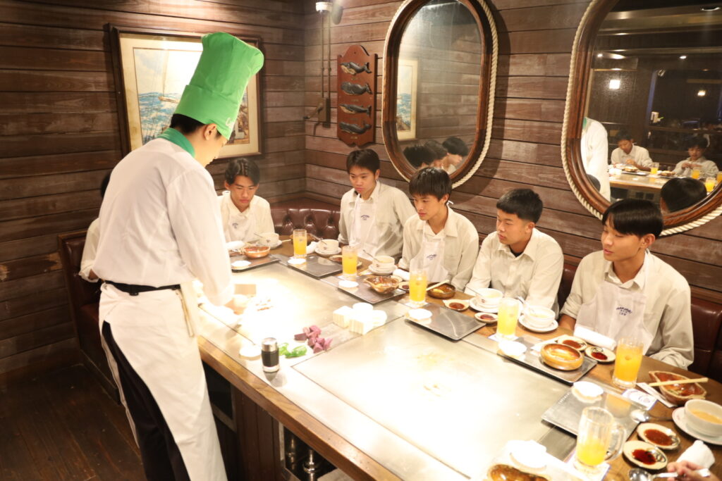目の前の鉄板で繰り広げられるシェフの華やかなパフォーマンスに大盛り上がり!