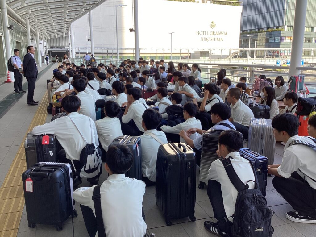 朝の広島駅では出発式が行われ、生徒たちは少し緊張しながらも、笑顔で元気に出発しました。