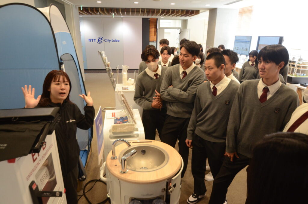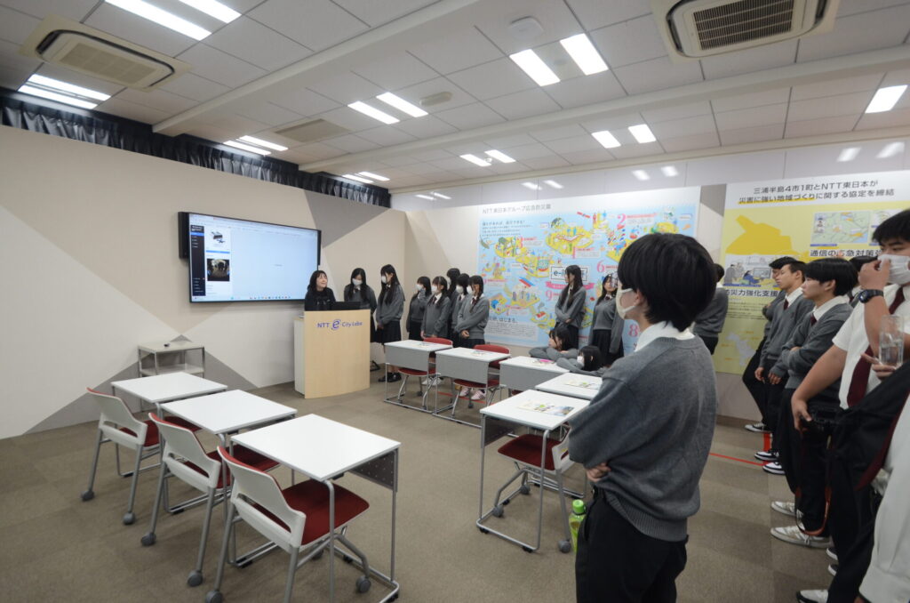 早めの昼食を済ませた生徒たちは新横浜駅で新幹線を降り、バスで多摩川を越えて東京都世田谷区を抜けて調布市の NTT e-City Laboに行きました。午後は学習の時間で、日本最大級の通信会社であるNTT東日本が推し進めている、新分野における通信事業の展開の展示を見て体験しました。これは最先端技術の博覧会のようなものであり、近未来の社会を体験できたものと思われます。