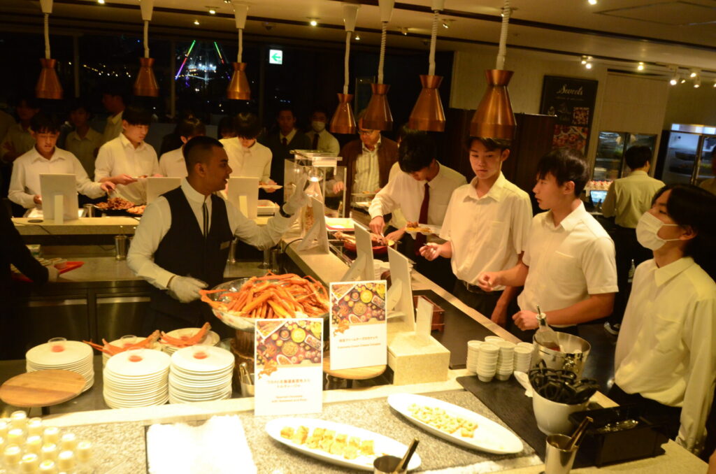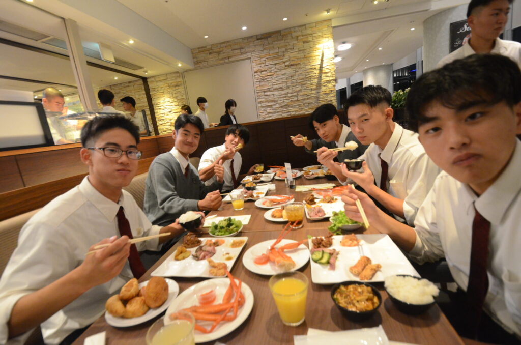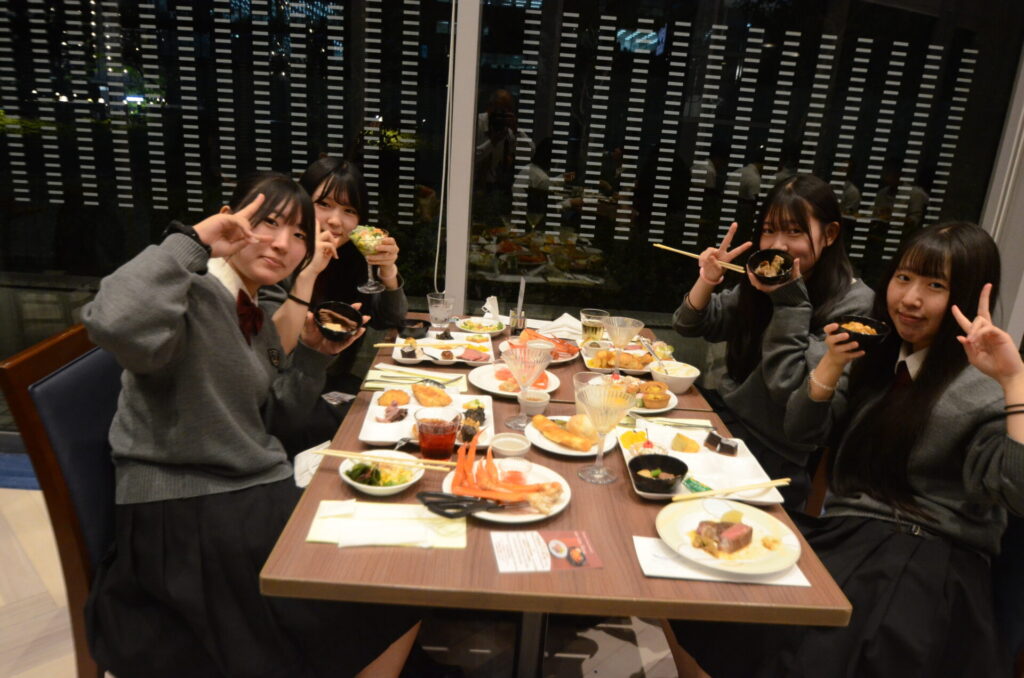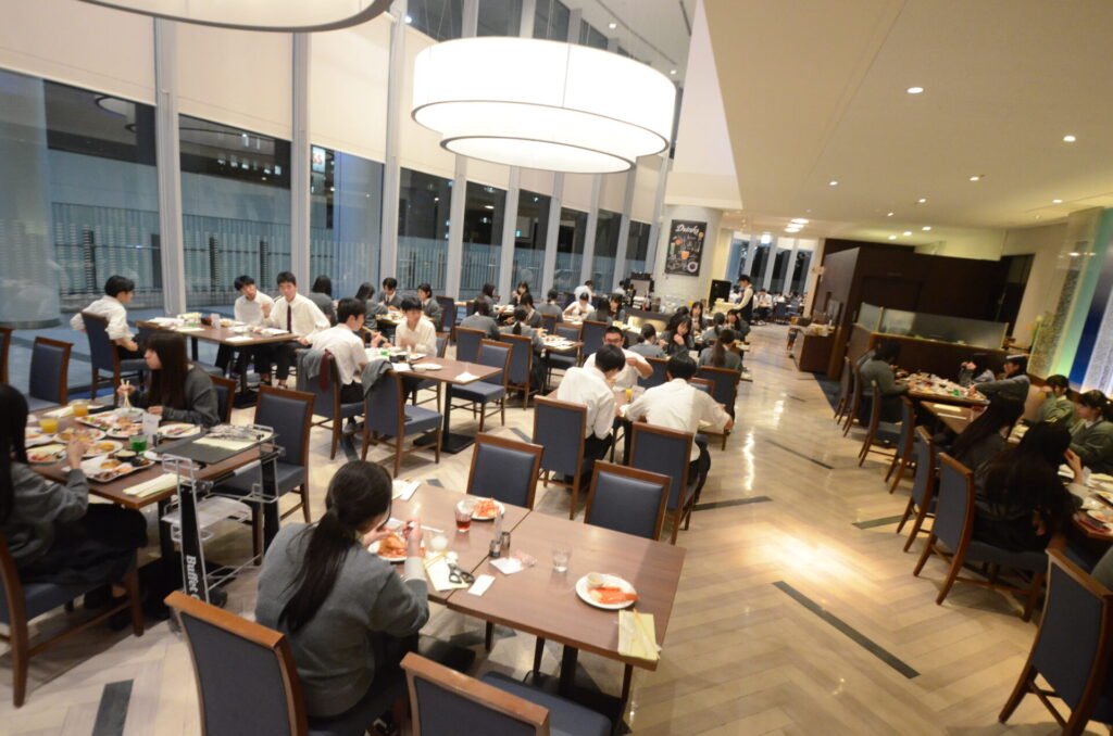 修学旅行 関東コース 第1日目 夕食風景 修学旅行 2025.10.07 夕方には東京ドーム球場の隣にある東京ドームホテルに宿泊しました。夕食はビュッフェ形式による北海道フェア。みんな楽しそうに談笑しながら食事をとっていました。