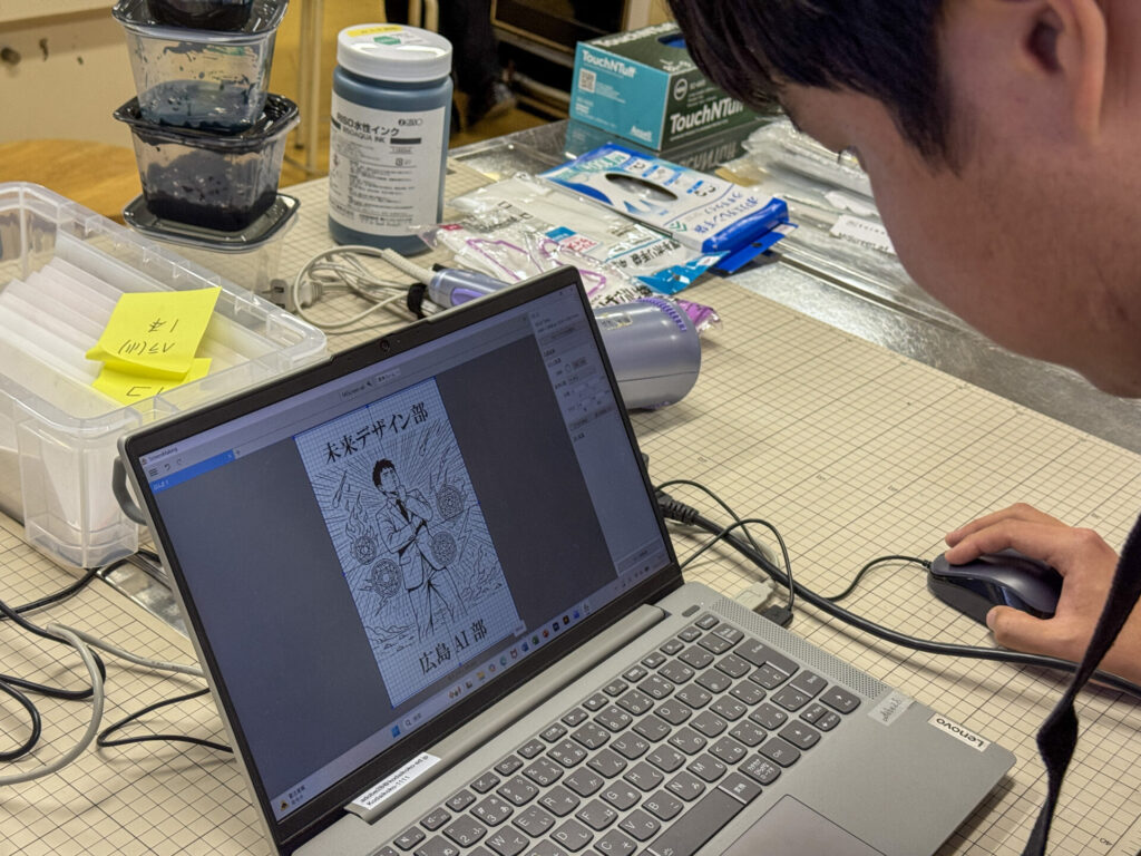 AIでデザインした自画像を、シルクスクリーンの機械に読み込ませて、版を作ります。