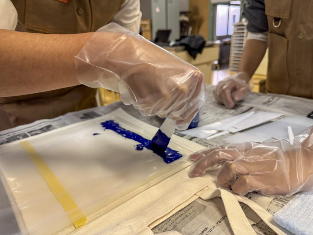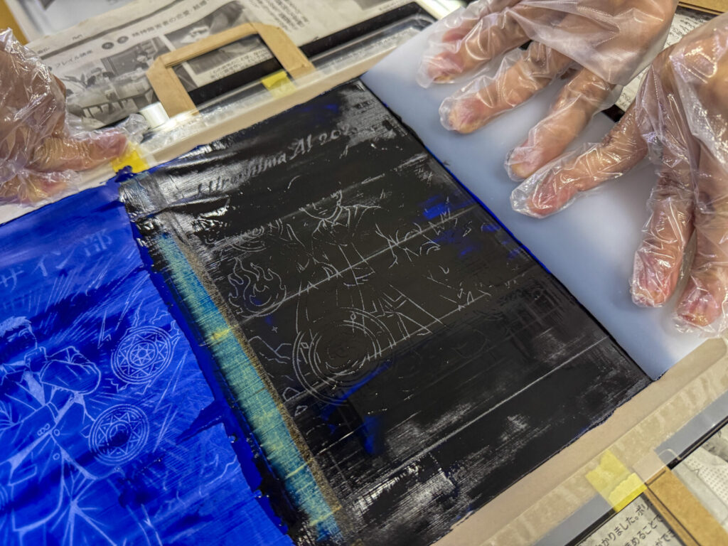 作成した版の上に専用のインクを乗せ、スクレイパーで漉くと…
