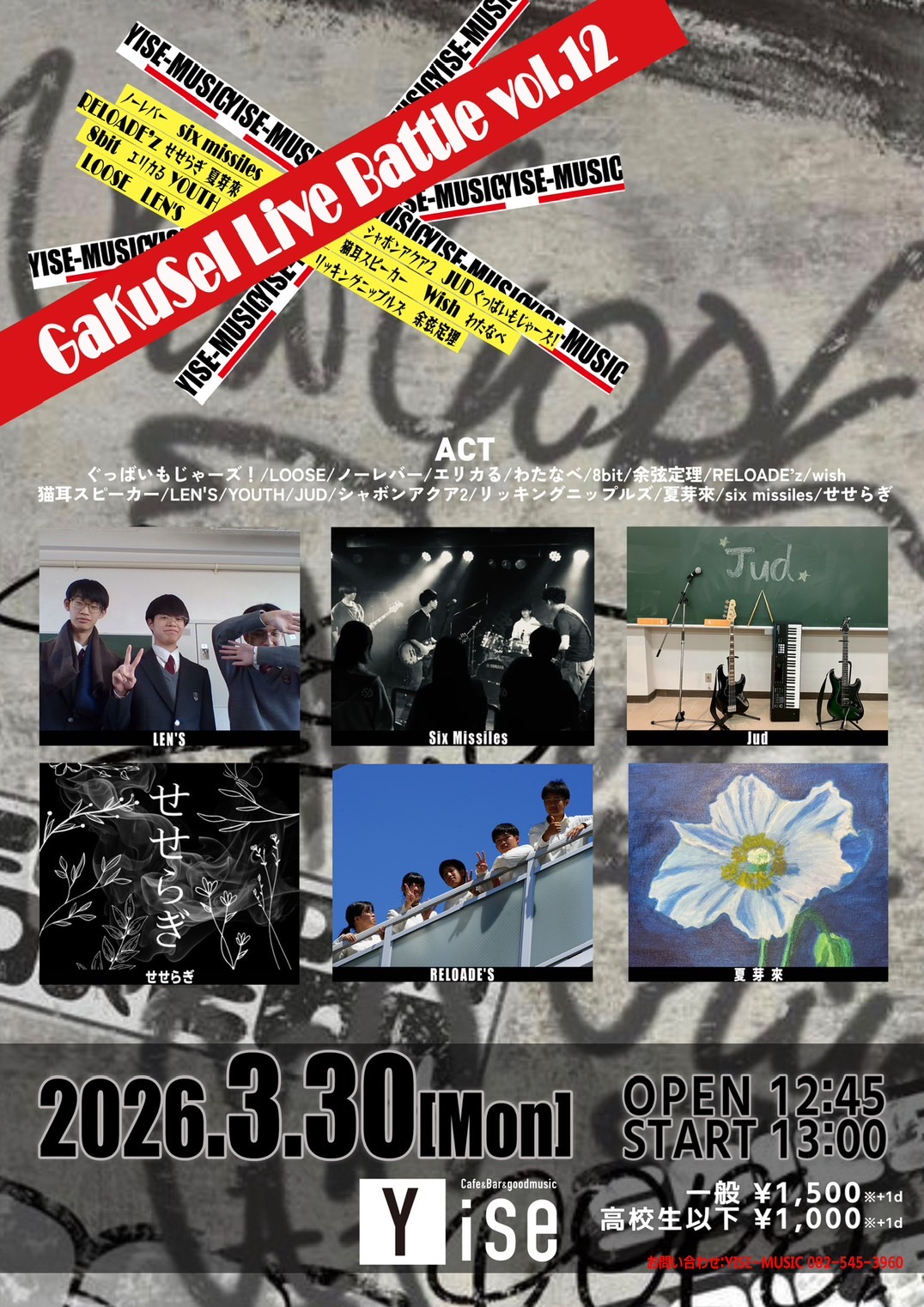 軽音楽同好会 ライブ告知 3/30 軽音楽同好会 2026.03.19 3月30日 月曜日に卒業ライブを行います 場所は「Yise(ワイズ)| Cafe & Bar & Good music」 広島県広島市中区紙屋町2丁目3−23 です Screenshot チケット代 高校生以下 1,000円(ドリンク代を含みます) 大学生以上 1,500円(ドリンク代を含みます) たくさんのご来場をお待ちしています。 (山口明)